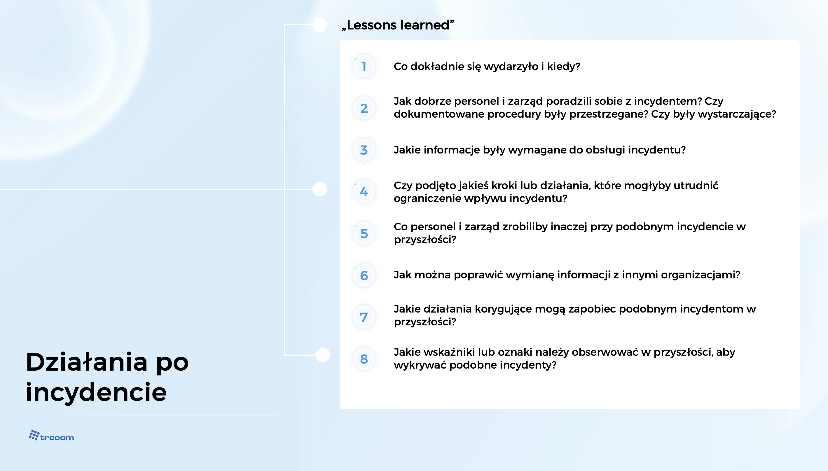 Działania po incydencie uwzględniają odpowiedź na pytania: 1) Co dokładnie się wydarzyło i kiedy?; 2) Jak dobrze personel i zarząd poradzili sobie z incydentem?; 3) Czy dokumentowane procedury były przestrzegane?; 4) Czy były wystarczające?; 5) Jakie informacje były wymagane do obsługi incydentu?. Działania po incydencie to również "lessons learned" czyli procesowe podejście do wyciągania wniosków z wdrożonego procesu obsługi incydentu stanowiące podstawę do poprawy procesów.