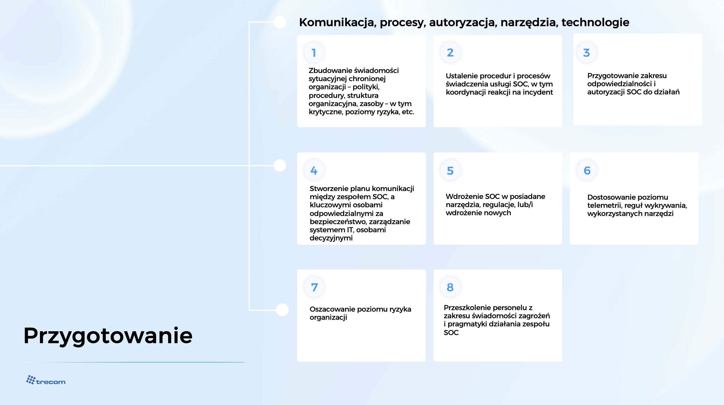 Efektywne działania SOC wymaga od organizacji wdrożenia jasno określonych procesów, których efektywność będzie poddawana weryfikacji - mowa m.in. o przygotowaniu na zbieranie incydentów, samej detekcji i analizy, izolacji czy działań po incydencie.